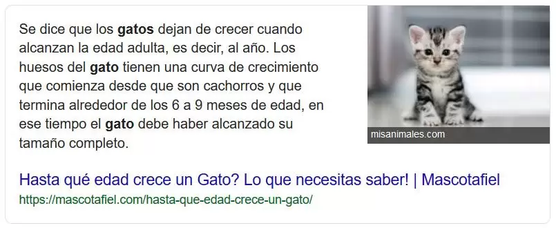 Pero si buscas cuánto crecen los gatos te aparecerá un párrafo destacado que intenta contestar tu pregunta. Eso es un featured snippet. ¿Lo entiendes? Genial. A otra cosa, mariposa.